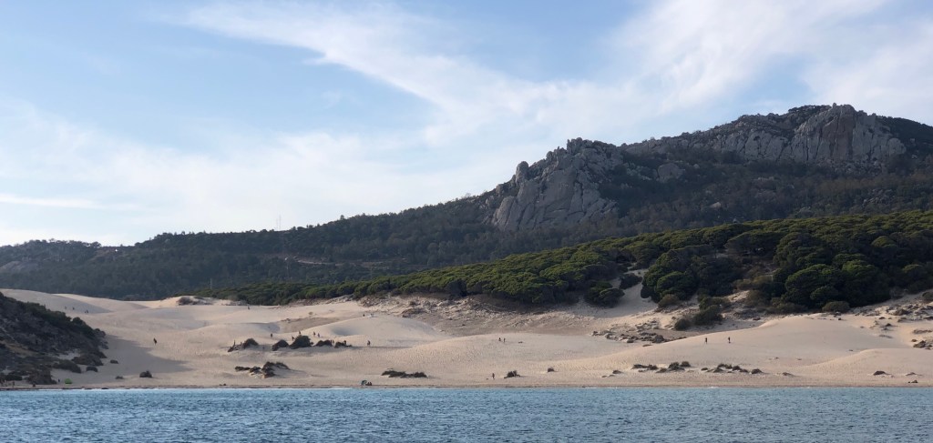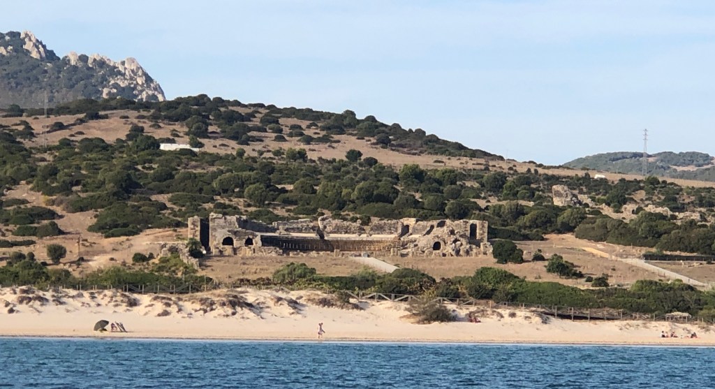Hier um die Ecke, in Zahara de los Atunes, wohnt unser Freund Liebrecht von Beyme. Leider schaffen wir es an diesem Tag nicht so weit. Wir haben paar Meilen früher das Anker werfen müssen. Ensenada de Bolonia: Ein bildschöner Sandstrand für uns ganz alleine und gleich daneben ein römisches Amphitheater.