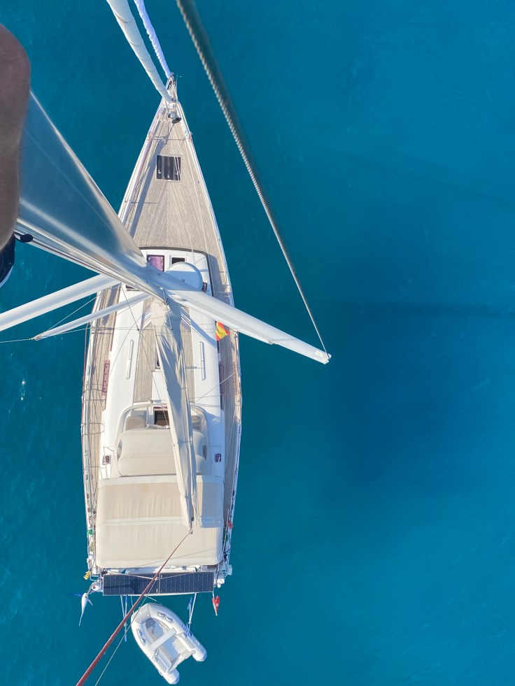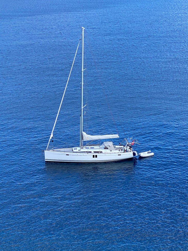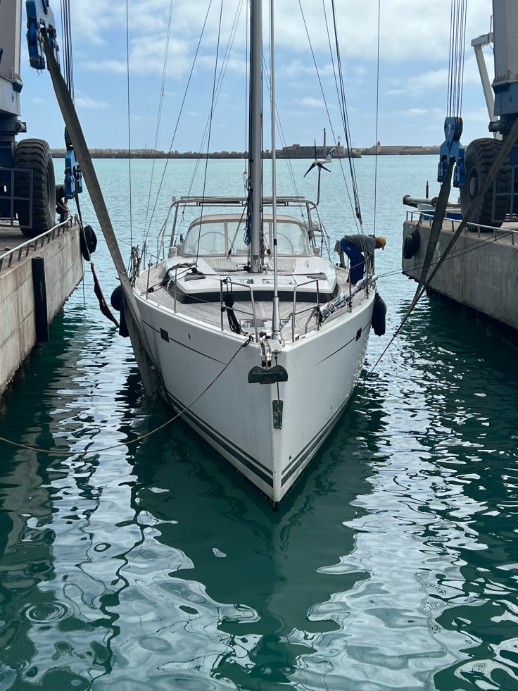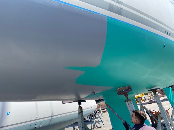 - Rumpf unter der Wasserlinie geschliffen bis an den Gelcoat, danach 5 Lagen Epoxyprimer appliziert (Osmoseschutz für weitere 10 Jahre) (2023)