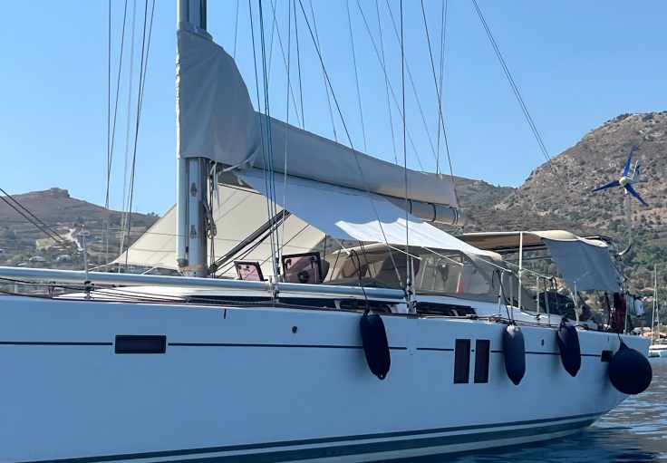 Sie ist ausserdem mit einem einziehbaren Bugstrahlruder, Faltpropeller, B&G-Navigationspaket und einem Beiboot (2024) mit Außenborder auf den Davits ausgestattet.