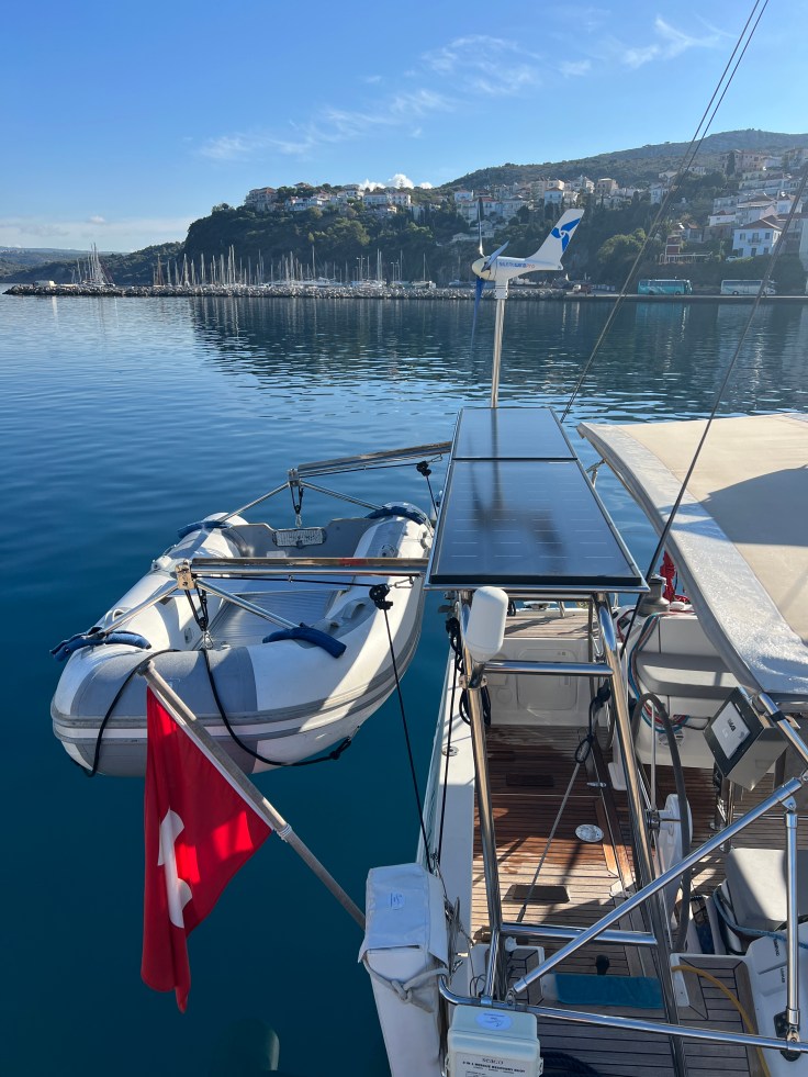 Das Energiesystem des Bootes mit 740W Solarzellen und 400 W Windgenerator ermöglicht lange Zeit autonom unterwegs zu sein. Der mobile Generator Honda 2.2I ist mit an Bord, wurde aber noch nie genutzt.